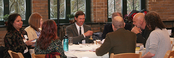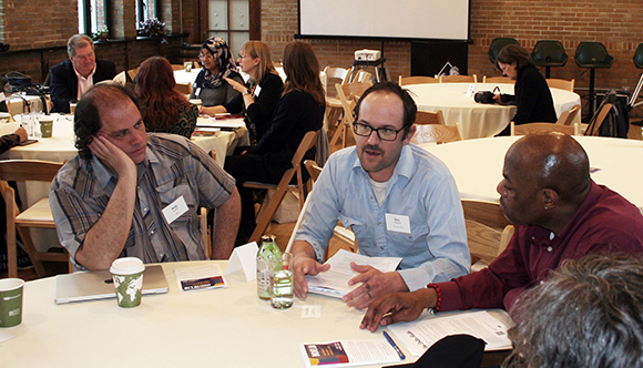 David Farnan, Director of Boulder Public Library District (left), Dan Simon, Publisher and Editorial Director at Seven Stories Press (middle), and Claire Kelley, IndieLib co-organizer and Seven Stories Marketing Director (right) during a break in panel sessions.